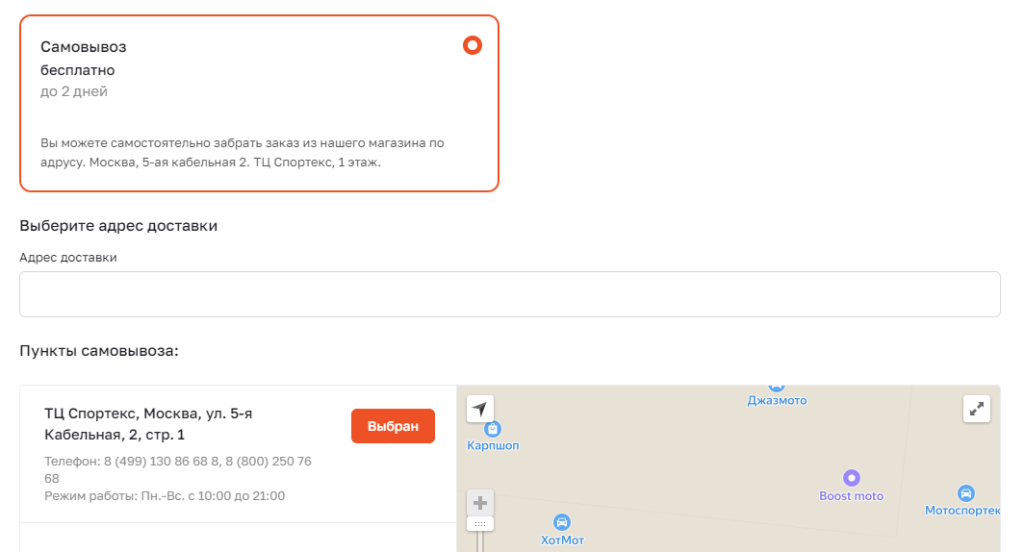 1. В форме «Доставка» выберите пункт «Самовывоз»: